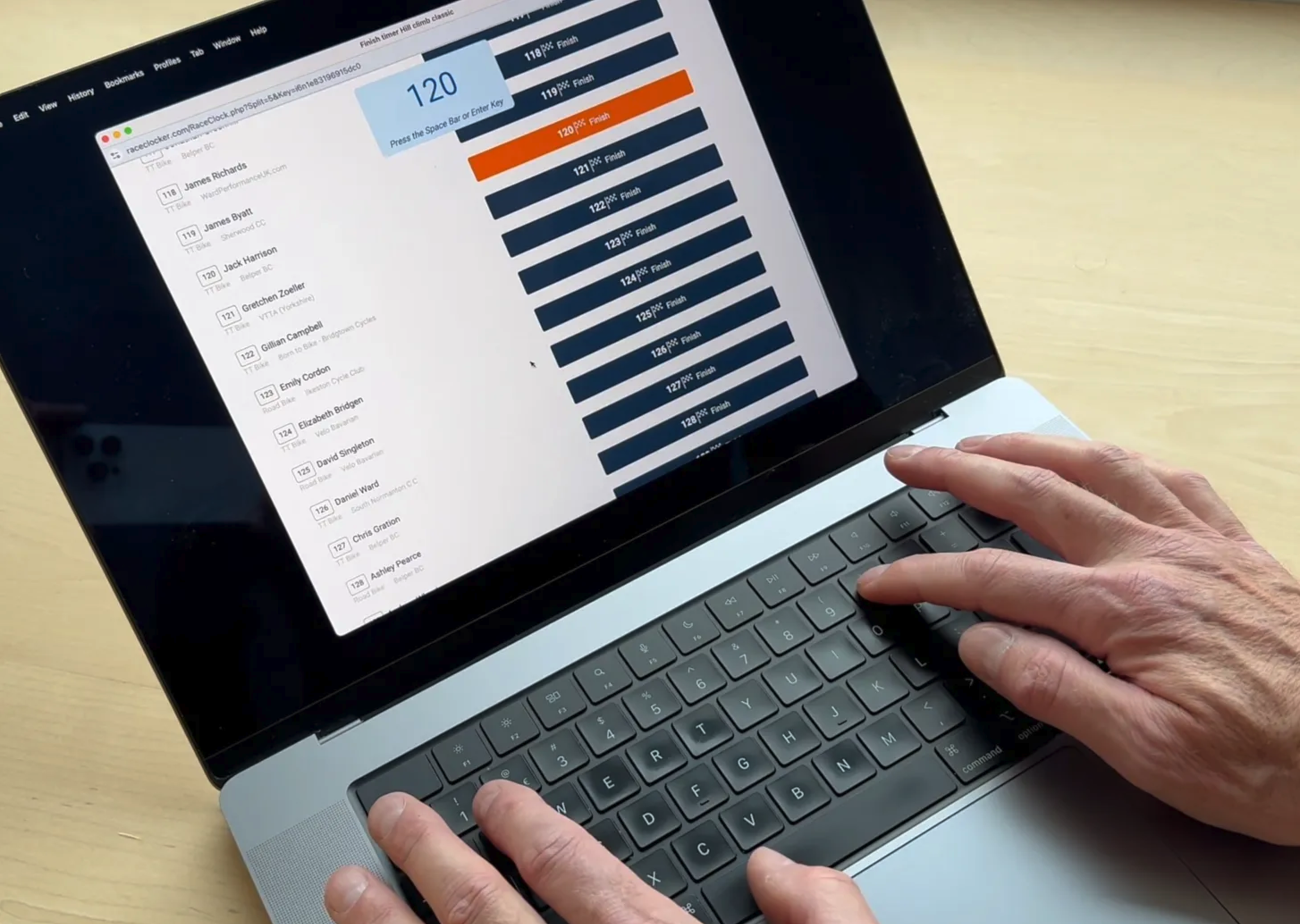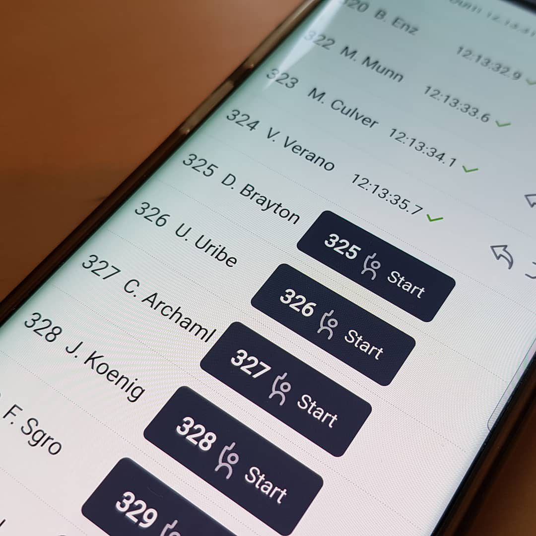 Timing from a smartphone is most popular but somewhat error prone especially in wet and cold outdoor conditions. Most reliable results are achieved when timing on a laptop or tablet device, and where the timekeeper is seated in a dry and comfortable location with a clear line of sight on the split point passing or finish line.