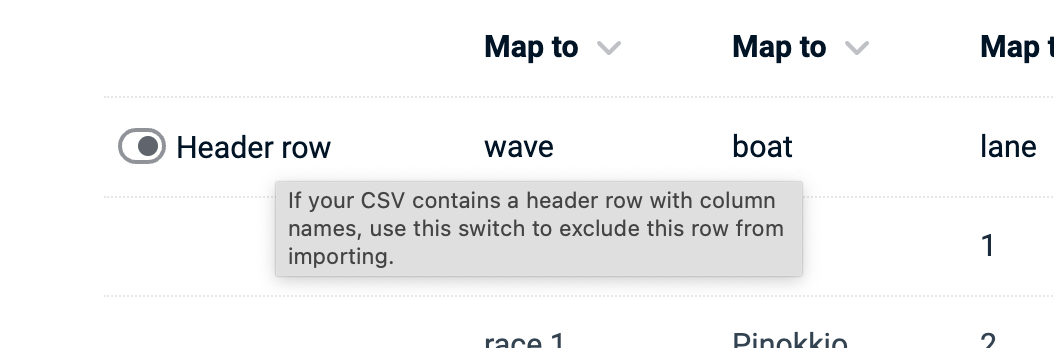 In case your data includes a column header row, you can hide it to avoid the header data being included in the race list (hiding will be ignored for the 'extra info' fields.