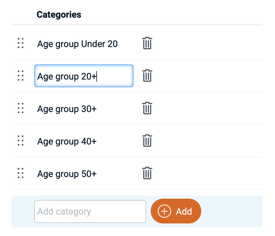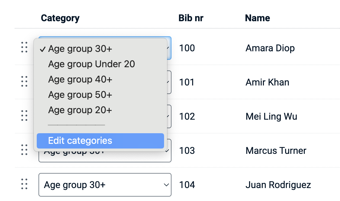In the category editor itself, the names of categories can be edited 'inline' and saved instantly. The order of categories can be changed via drag/drop. The order of categories is relevant when viewing results grouped by category - as they will have the same order as set here in the category editor. Deleting a category will also delete all participants in that category.