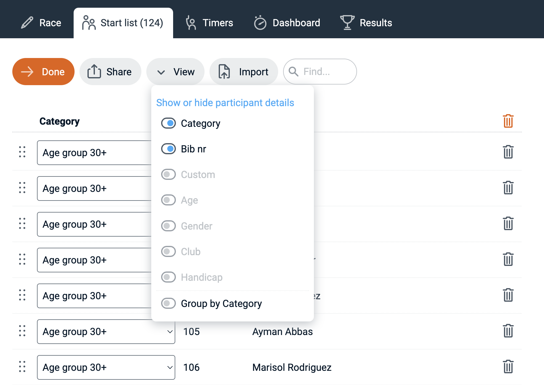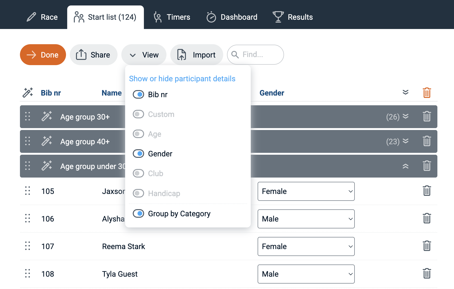 RaceClocker start lists can include categories, bib numbers, a team or club name, age, gender, a handicap factor as well as a 'custom' field in addition to the participant's name. All fields other than 'Name' are optional. If your race has wave starts then the start list will be grouped by wave. A time trial or a mass start race can also be grouped by category, via the 'View' menu. Turning on/off these fields will hide or show them not only in the start list, but also in the timers and in the results.