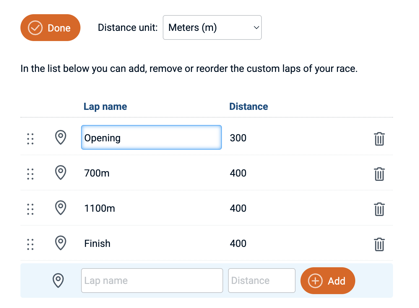 When the race type is set to custom laps, the 'lap editor' enables you to edit laps. Laps can be added, removed, reordered, renamed and the individual lap distance can be set. In some special sport types - for example HYROX and Spartan DEKA races, the custom lap editor will be prefilled with the 'stages' for those race types.