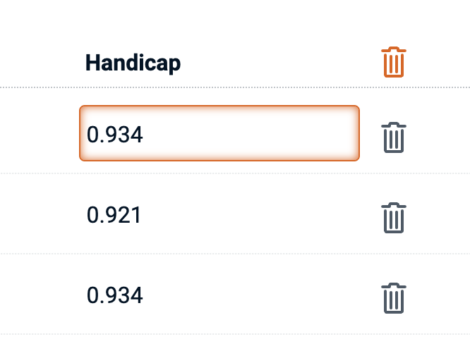 At any time the start list can be edited directly in the editor. Just click on a field and start typing. Fields can be navigated quickly using the keyboard. 'Enter' and 'Shift + Enter' move the focus up and down the grid. 'Tab' and 'Shift + Tab' move the focus right and left. Participants can be removed from the start list by clicking on the delete icon. The entire list can be cleared by clicking on the orange delete icon at the top of the list (you'll be asked for confirmation).