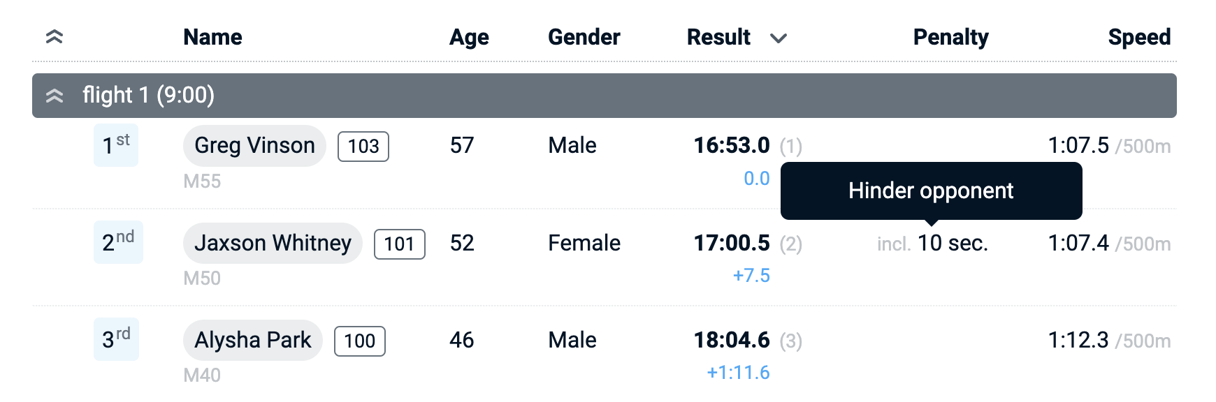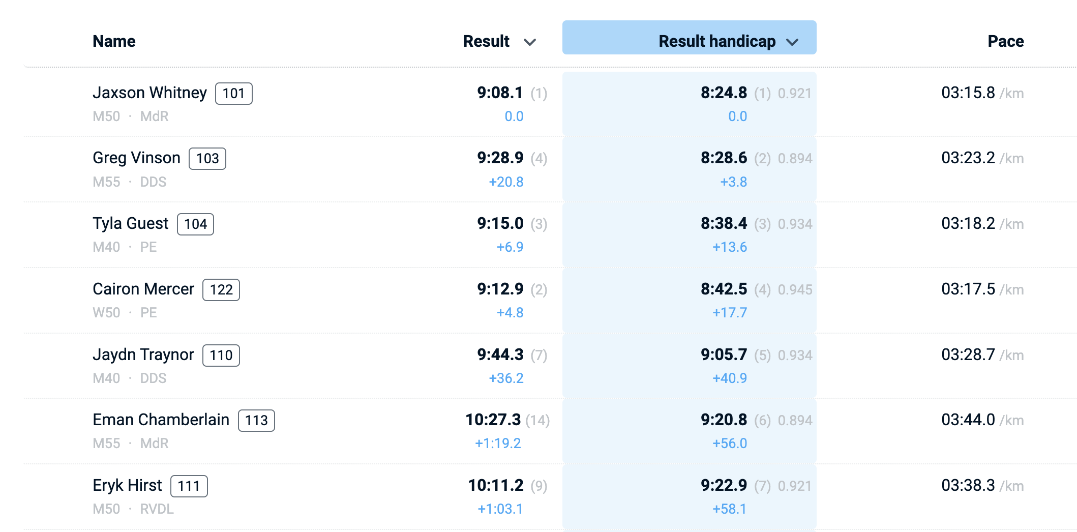 Results are multiplied with these individual factors and displayed in separate column next to actual results. Clicking the column header will sort by handicap results. Speed is not affected by the handicap factor and therefore based on the non-adjusted result.
