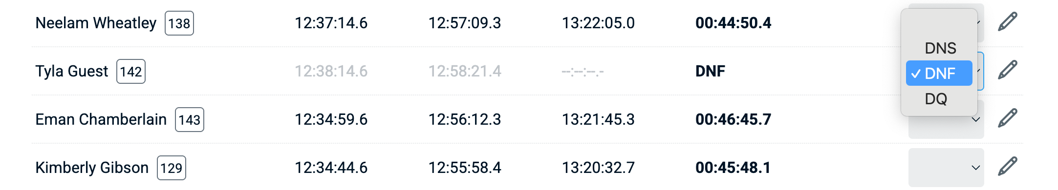 Additionally, the race manager can set a participant manually to DNS (did not start), DNF (did not finish) or DQ (Disqualified).
