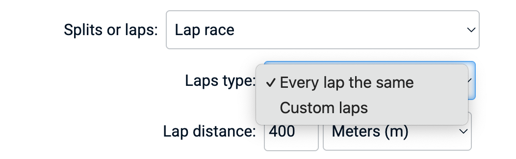 Lap races can be further differentiated between a lap race where each lap is the same (and with the same distance), or when all laps can be custom defined (both in name and in distance)