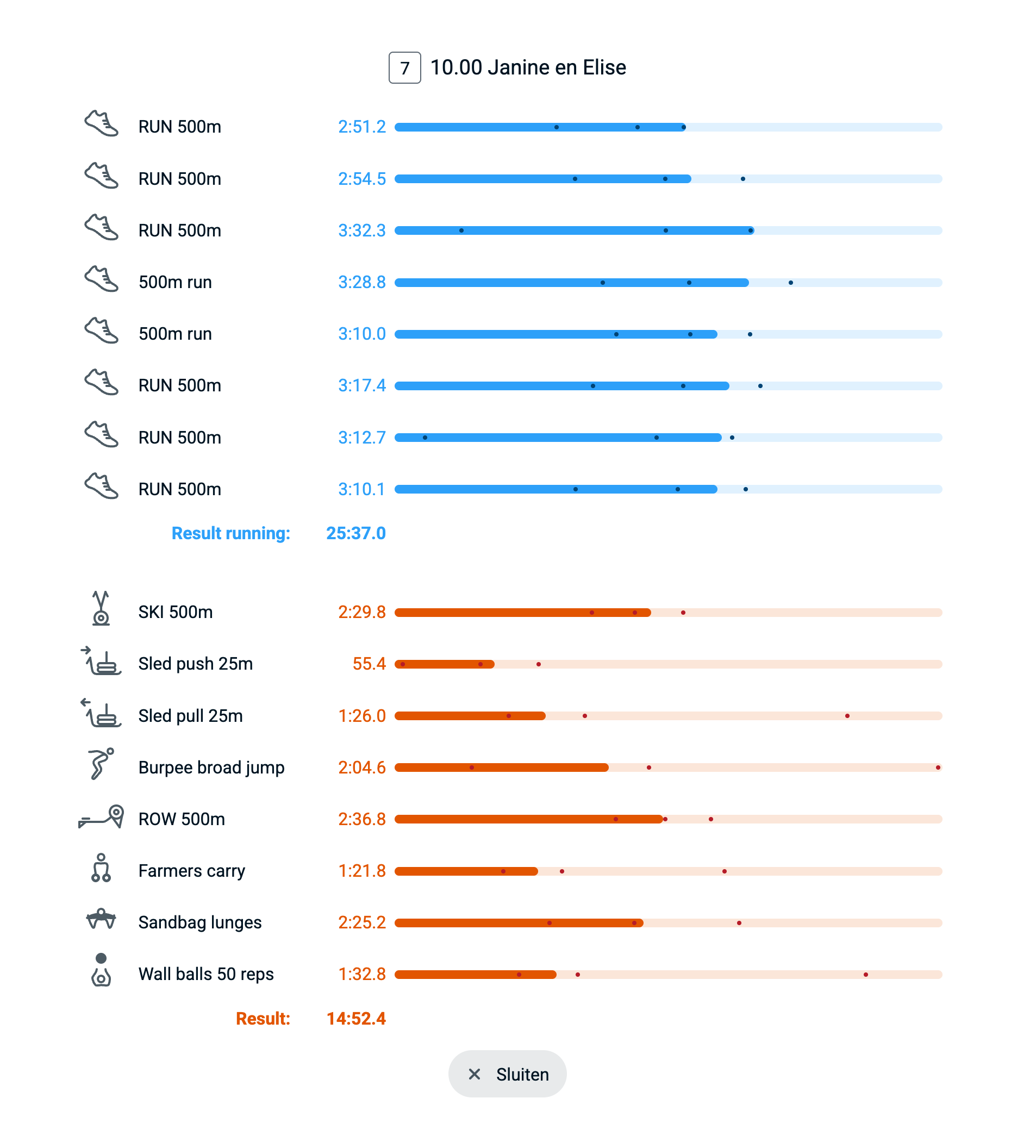 When a race has 'custom' laps defined, they appear including icon and name in this chart. A special case is made for HYROX races where runs are listed separately from the Rox-zone event.