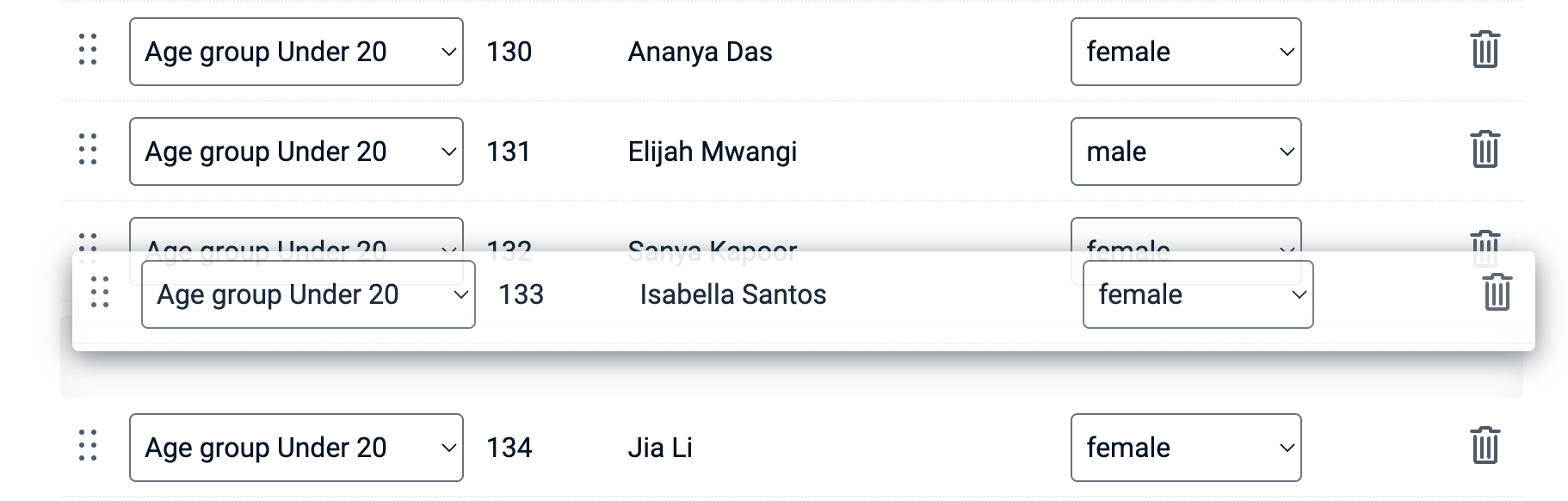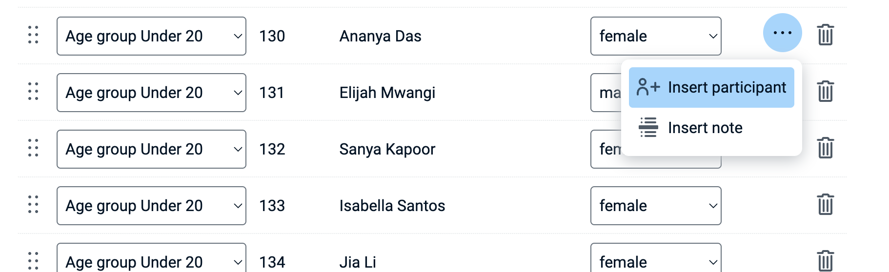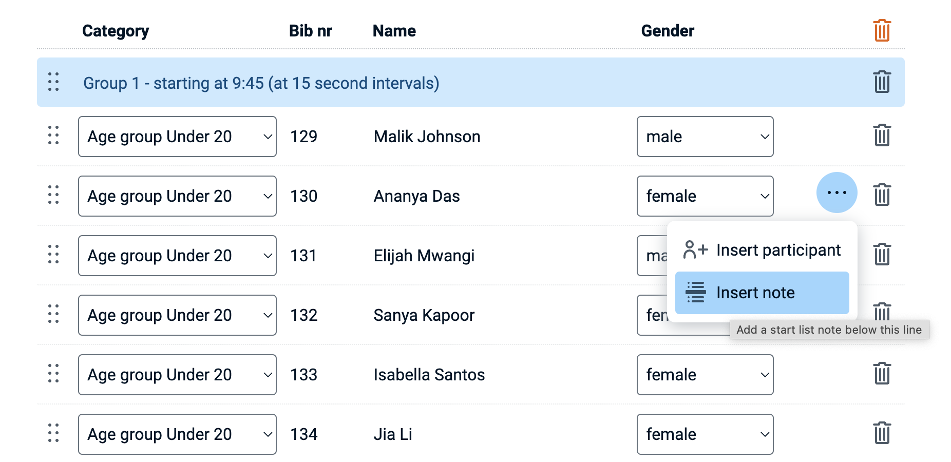 Participants can be added to the start list anywhere in the order. Via a menu entry point on the far right side of each row a new row can be inserted to add another race participant.