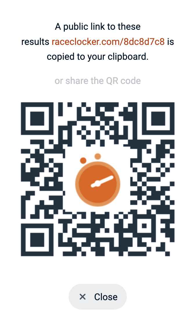 RaceClocker results can be shared publicly via the 'Share Link' button that copies a short and public URL to the clipboard. It also shows a QR code that can be printed or displayed so that participants can easily find or get to the race results.