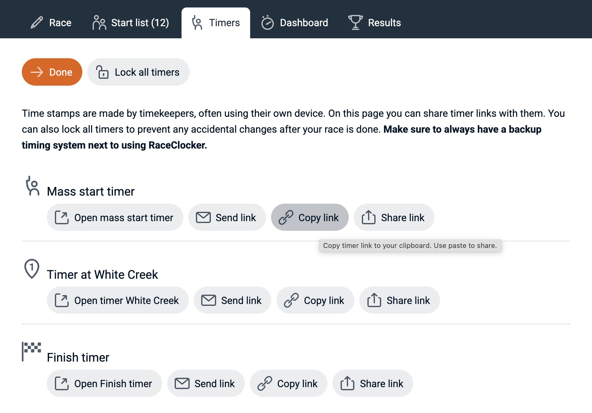 The 'Timers' page is the interface from where the race manager or timing director can open or share timer links with the timekeepers, the people on race locations that do the actual timing. For each timing point the first button opens a timer app window on the current device, the second button will send a timer link via mail and the third copies or shares a link to the timer to the clipboard (so it can be shared via chat for example).