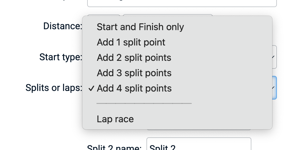 RaceClocker differentiates between races from start to finish, where these can be at different physical locations. Along such A to B course, a maximum of 4 split points can be defined. The other supported race format is a lap race where the same course is completed multiple times (without a maximum).