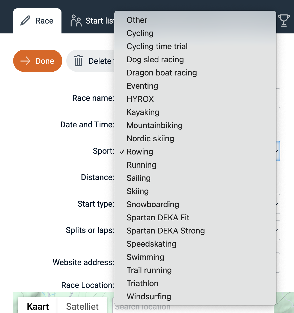 RaceClocker supports a broad range of sports. Setting the sport type is used to adjust sport specific timing features, interface labeling, data settings and visualization. The list below shows the currently available sport types.