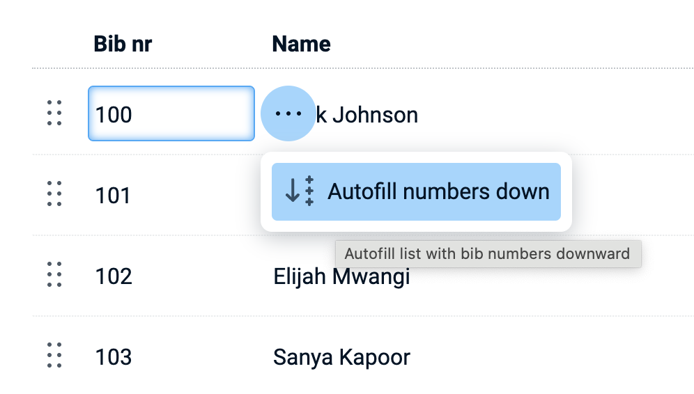 Bib numbers can be automatically numbered from any point in the list. Enter a number in the bib number field and then pick the option 'Autofill numbers down' from a small menu next to the active bib number. This will increment the bib number on each race participant downward in your list.