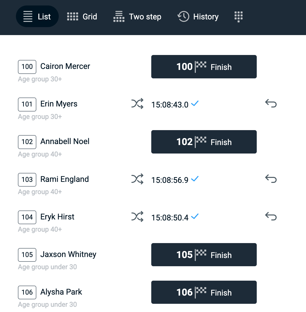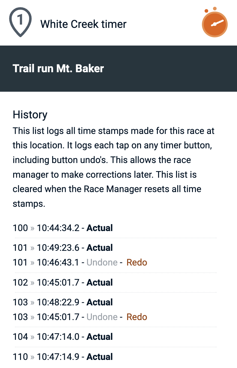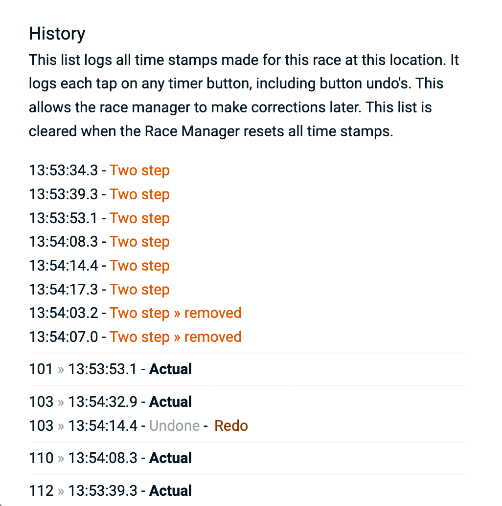 When a time stamp gets 'undone' by the timekeeper or by the race manager this is also indicated in the history. Any undone time can also be 'redone' in case of accidental removal or overwriting.