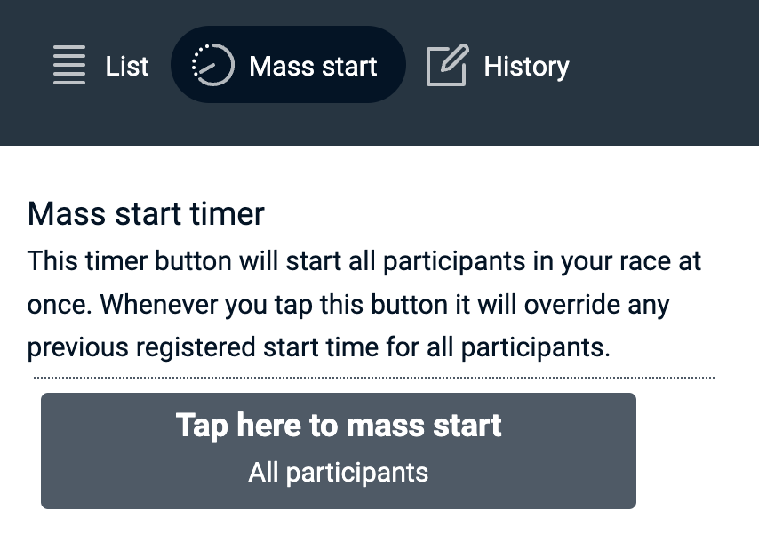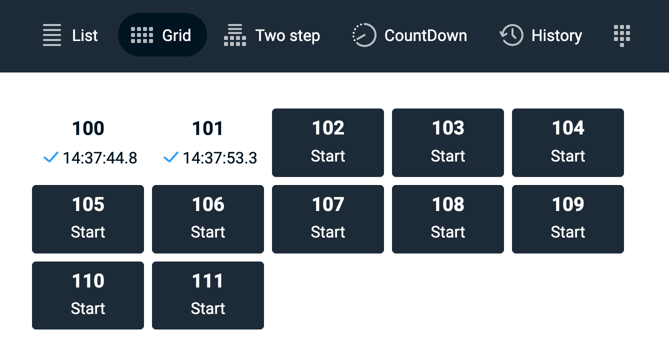 The start timer for a time trial enables each race participant to be timed individually. The start timer supports a couple of different timing modes which the timekeeper can choose between. All modes are kept in synch, so switching between timing modes during a race is fully supported.