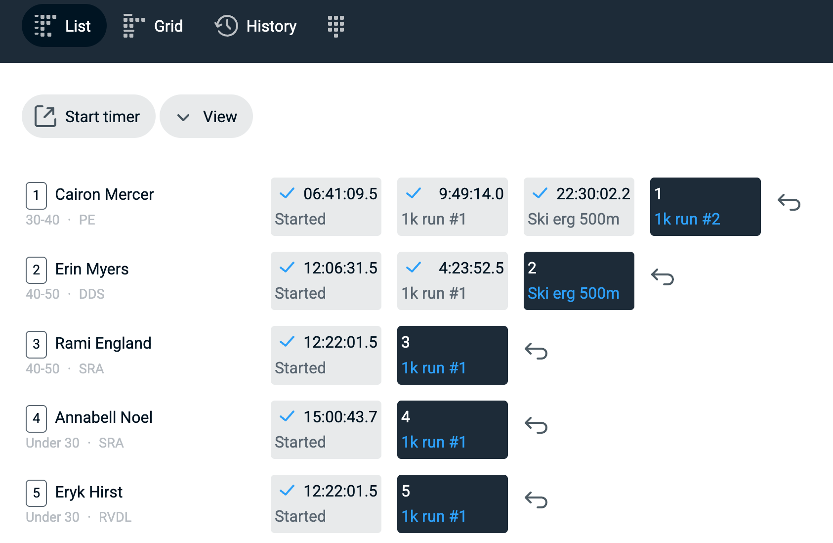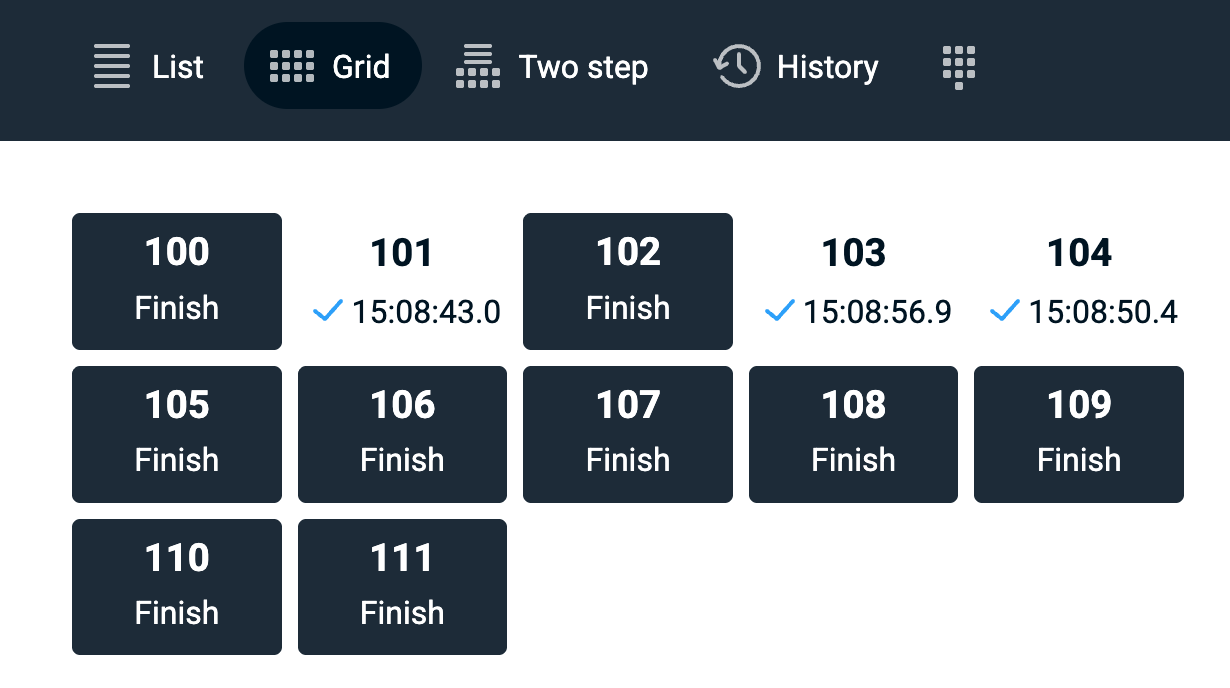 Any timing action can be monitored live through this history viewer. As soon as a timer button is pressed in the timekeeper app, the result will appear in the history (as well as in the dashboard itself). History includes each and every timing action that a timekeeper makes, like non-assigned 2-step timings, laps in a lap race, undone timings, reassigns etc. etc. The History view is also included in the actual timekeeping app on a separate tab.