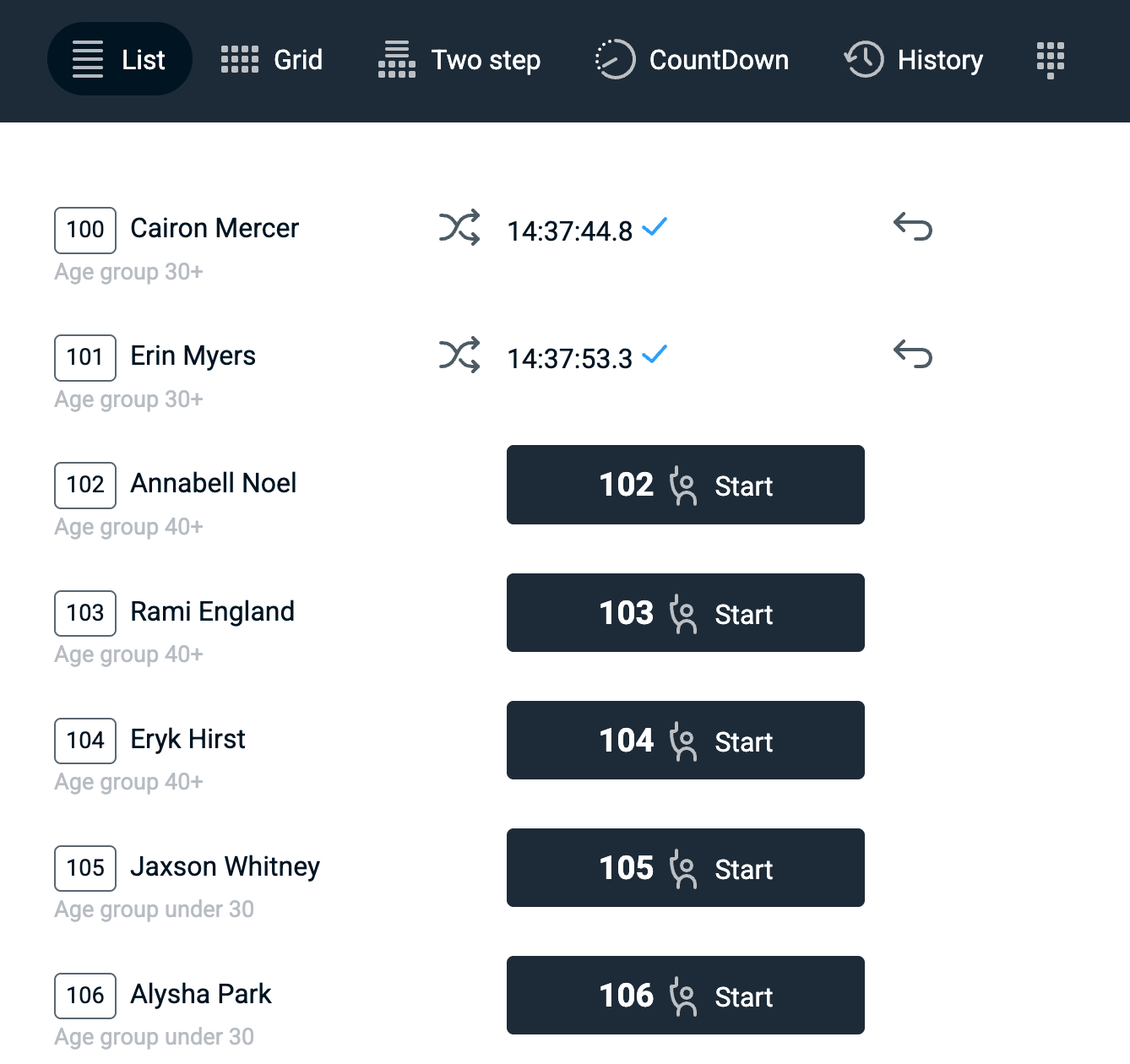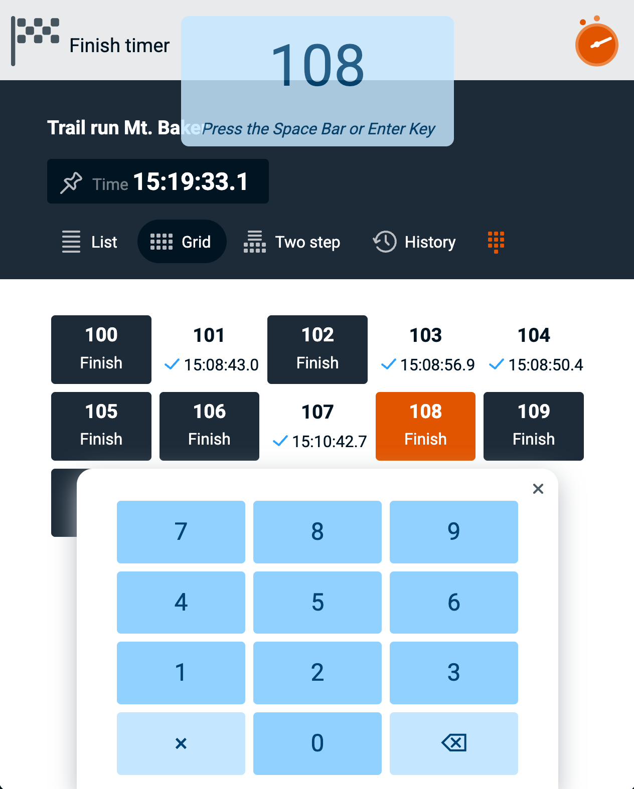 All timing actions by the timekeeper are logged and stored on the RaceClocker server until the race manager 'resets' the race. The history is ordered by start list or seeding order. Multiple registered times can be linked to a single participant, including 'undone' times. At the top of the list time stamps are included that are not linked to a race participant - these are the raw timings from the 'Two step' timer.