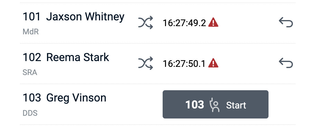 Additionally, next to times that have not been synched with the RaceClocker server due to loss of connectivity a red warning triangle will appear instead of a blue check mark. As soon as connectivity is restored all red triangles will get replaced with blue check marks, indicating that all time stamps have been received on the server and visible in the Timer Dashboard.